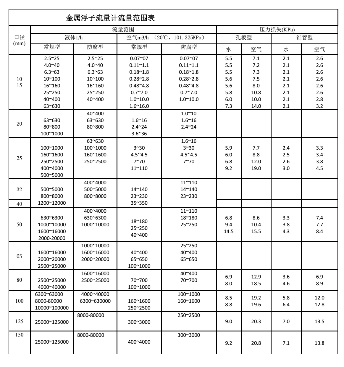 流量范圍對照表: